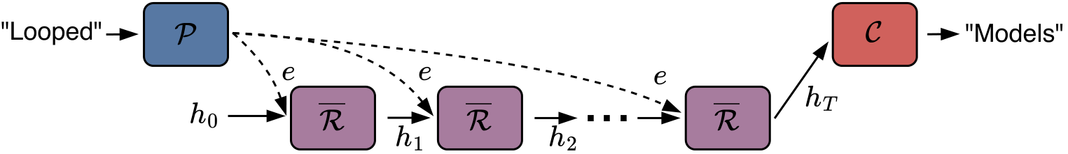 - Recurrence: The recurrent block iteratively updates a hidden state $h_t$ for $T$ loops. To maintain the input’s influence, $e$ is injected into each loop, typically via addition [1] ($h_{t+1} = \recurrent(h_t + e)$) or concatenation with projection [2] ($h_{t+1} = \recurrent(W[h_t; e])$).