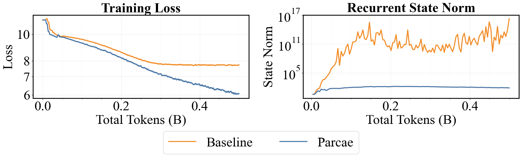 When retrofitting a very strong Transformer baseline into an RDM, without any hyperparameter tuning, we found Parcae to be robust over RDMs (which just flat-out diverged).
