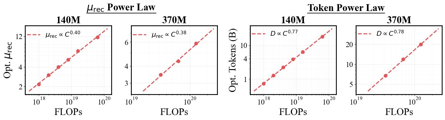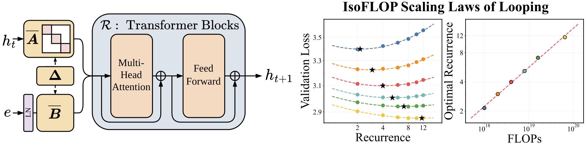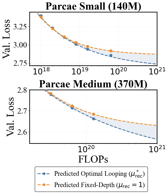 - Scales Predictably: We establish the first scaling laws for looping, finding that compute-optimal training requires increasing looping and data in tandem.