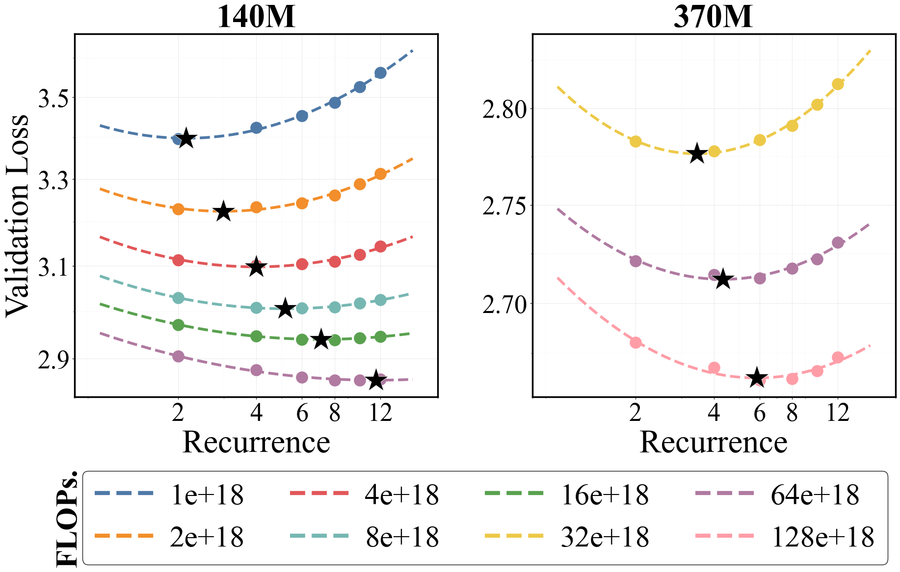 But is looping actually FLOP-efficient? To study this, we explore a setting where, under a fixed parameter count and FLOP budget, we trade off mean recurrence during training against data. That is, if we increase mean recurrence, we reduce the amount of training data so the total FLOP budget stays fixed.