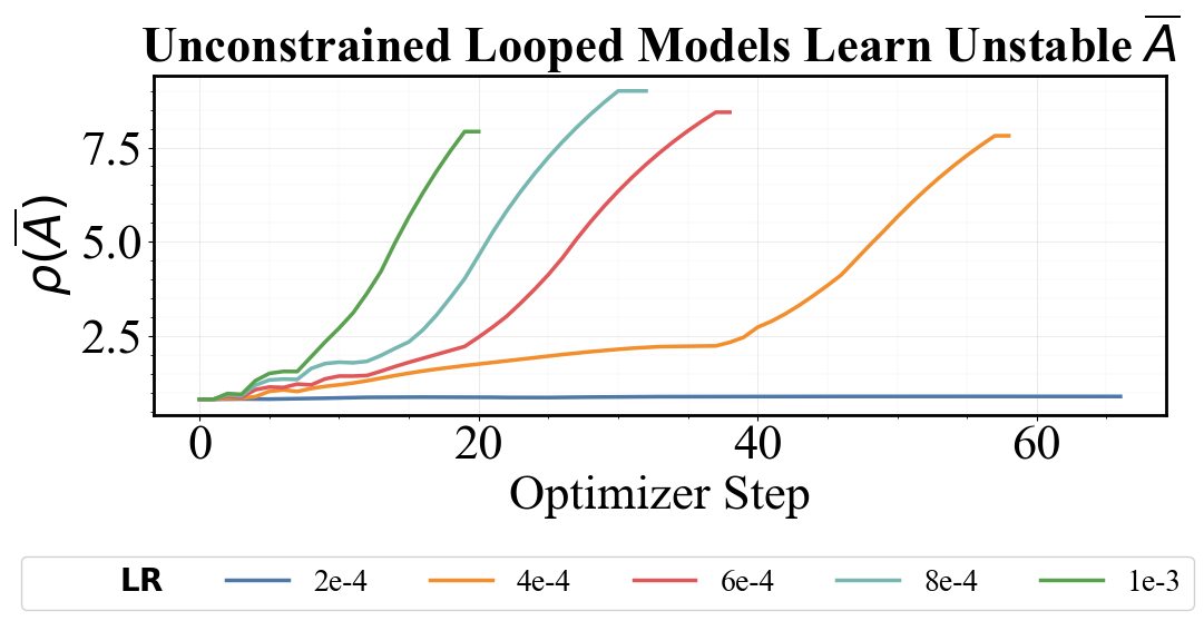 While this analysis bypasses the nonlinearities of looping (e.g., Attention and MLP units), the table and figure above confirm that our analysis is important empirically: divergent runs learn a spectral radius of $\rho(\dA) \geq 1$, with convergent runs maintaining $\rho(\dA) < 1$. When we maintain LTI conditions with Parcae, looped models become significantly more robust to hyperparameter selection.